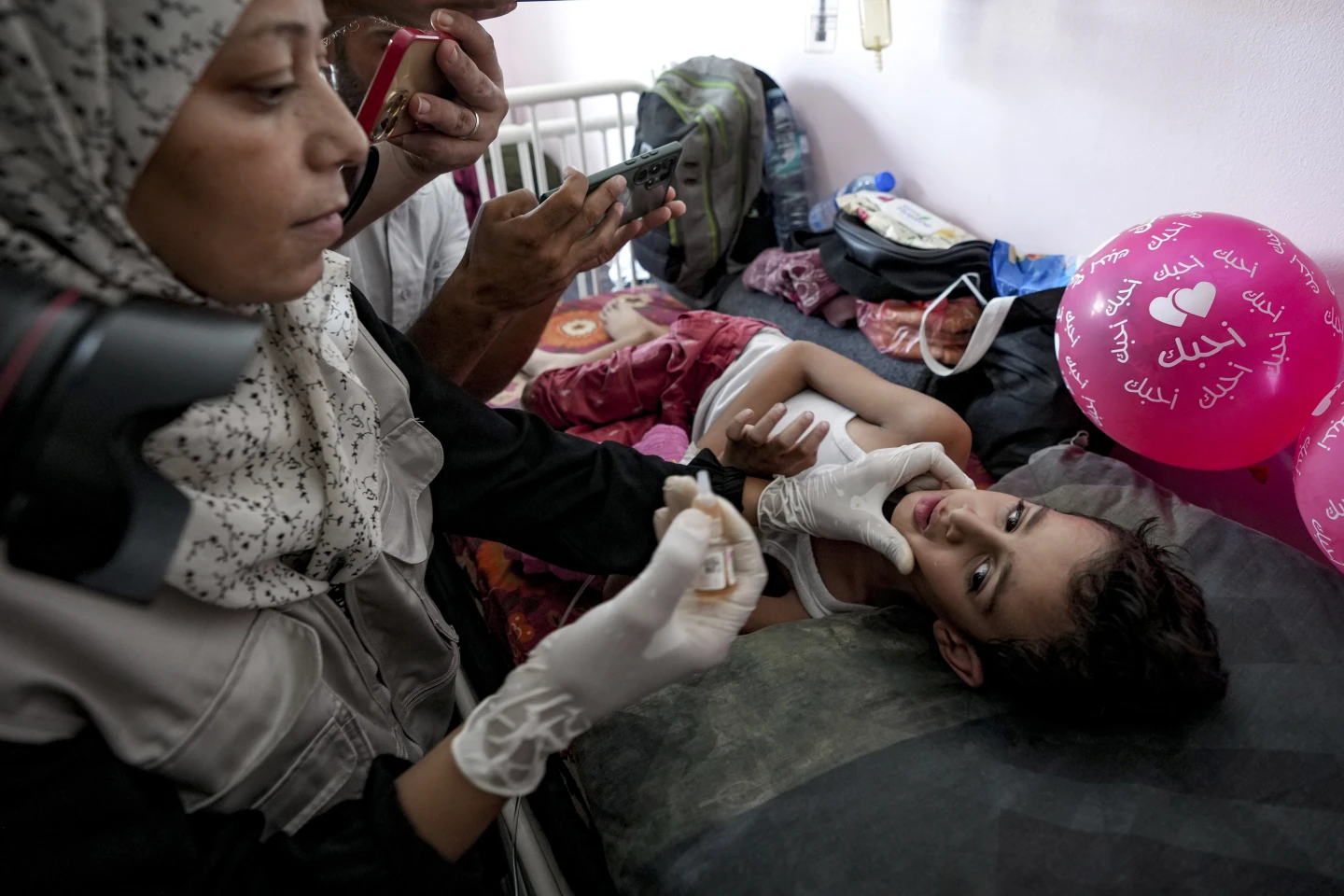A small number of children in Gaza received vaccine doses a day before the large-scale rollout and limited pauses in the fighting agreed to by Israel and the U.N. World Health Organization. Associated Press journalists saw about 10 children receiving doses at Nasser hospital in Khan Younis.