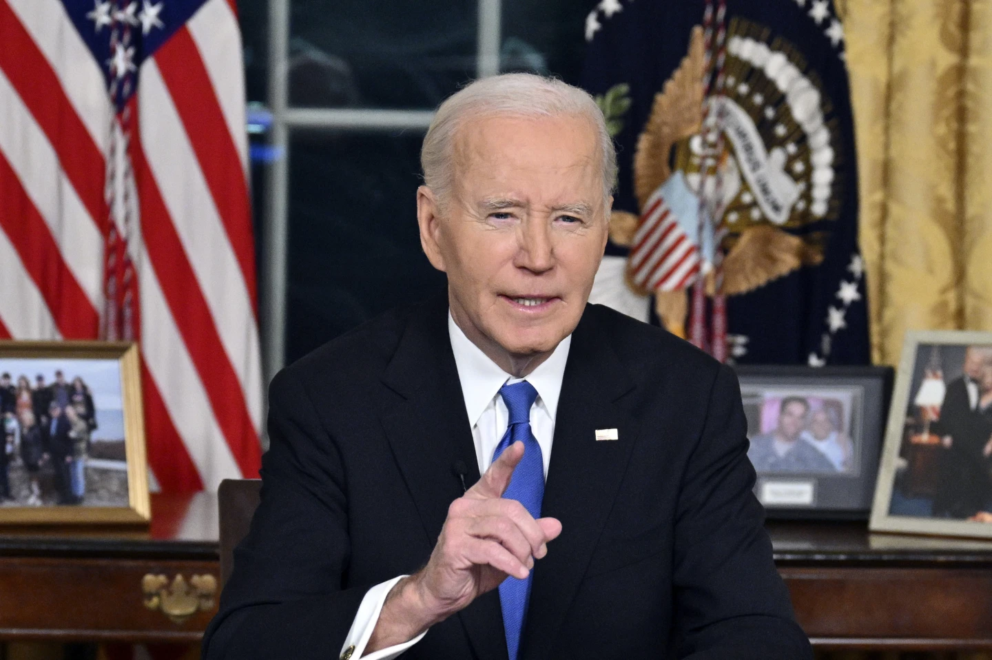 Biden spoke from the Resolute desk, photos of his family visible behind him in the Oval Office. First lady Jill Biden, his son Hunter, some of his grandchildren, Harris and her husband, Doug Emhoff, sat watching.