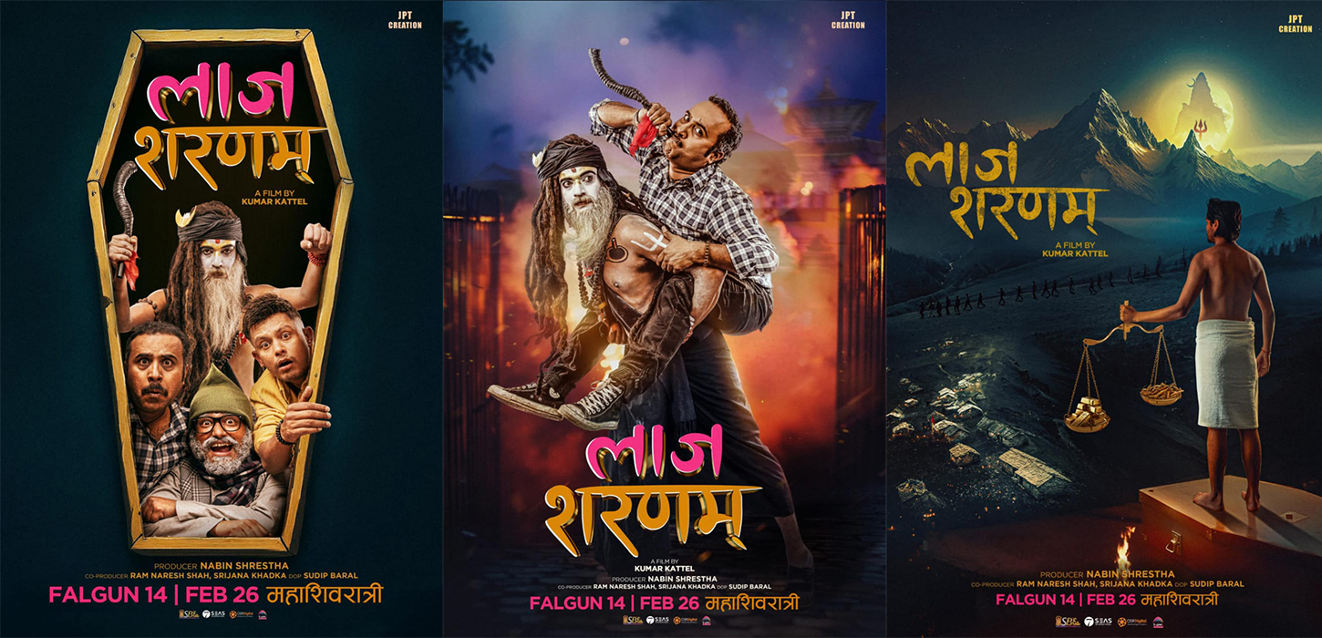 तेस्रो पोस्टरमा हातमा तराजु बोकेर एक व्यक्ति कफिनमाथि उभिएका छन्। उनको अगाडि हिमाल र त्यसको काखमा बस्ती देखिन्छ। ‘लाज शरणम्’ ले गम्भीर विषयलाई रमाइलो तरिकाले कथा भन्ने पोस्टरले संकेत गरेको छ।
