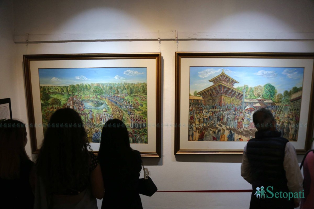 यस प्रदर्शनीमा भएका चित्रहरु प्रायः काठमाडौं केन्द्रित छन्। काठमाडौं उपत्यकाका चाडपर्व, मल्लकालदेखि शाहकालसम्मका राजाहरू, राजदरबारका गतिविधि, नाच, जनजीवन लगायत चित्र प्रदर्शनीमा छन्। प्रदर्शनीमा उनले काम गर्ने क्यानभास, कलरहरू पनि राखिएको छ।