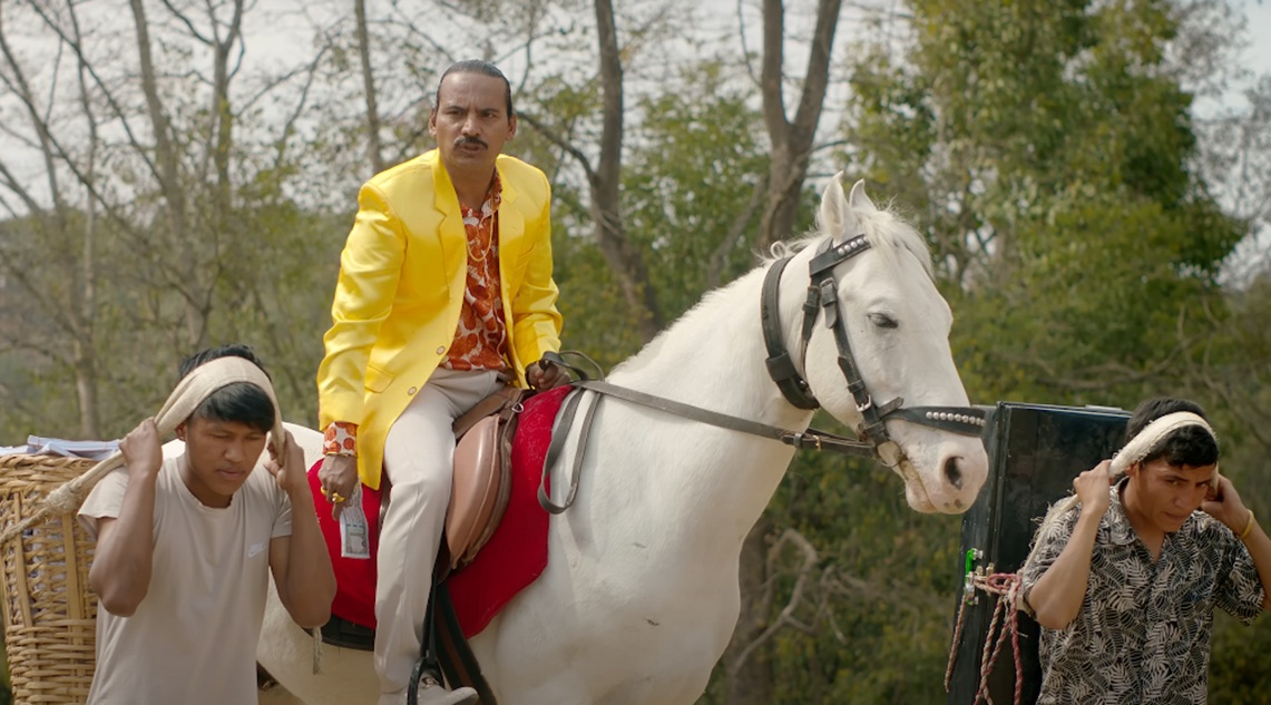 कुनै फाँटमा घोडामा चढेर आइरहेका उनले गाउँलेलाई पैसा बाँडेको दृश्यबाट टिजर सुरू हुन्छ। रमाइलो खालको यो टिजरमार्फत फिल्मको कथावस्तु र पात्रबारे जानकारी दिन खोजिएको छ।
