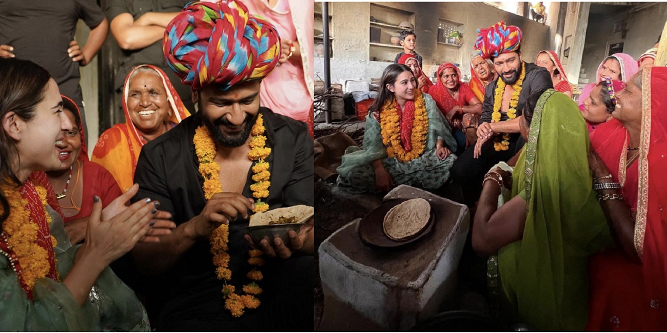 विक्की राजस्थानी पगडीमा देखिएका छन् भने सारालाई कुर्था सुरूवालमा देखिएकी छन्। उनीहरूले उक्त परिवारसँग बसेर खान पनि खाएका थिए।