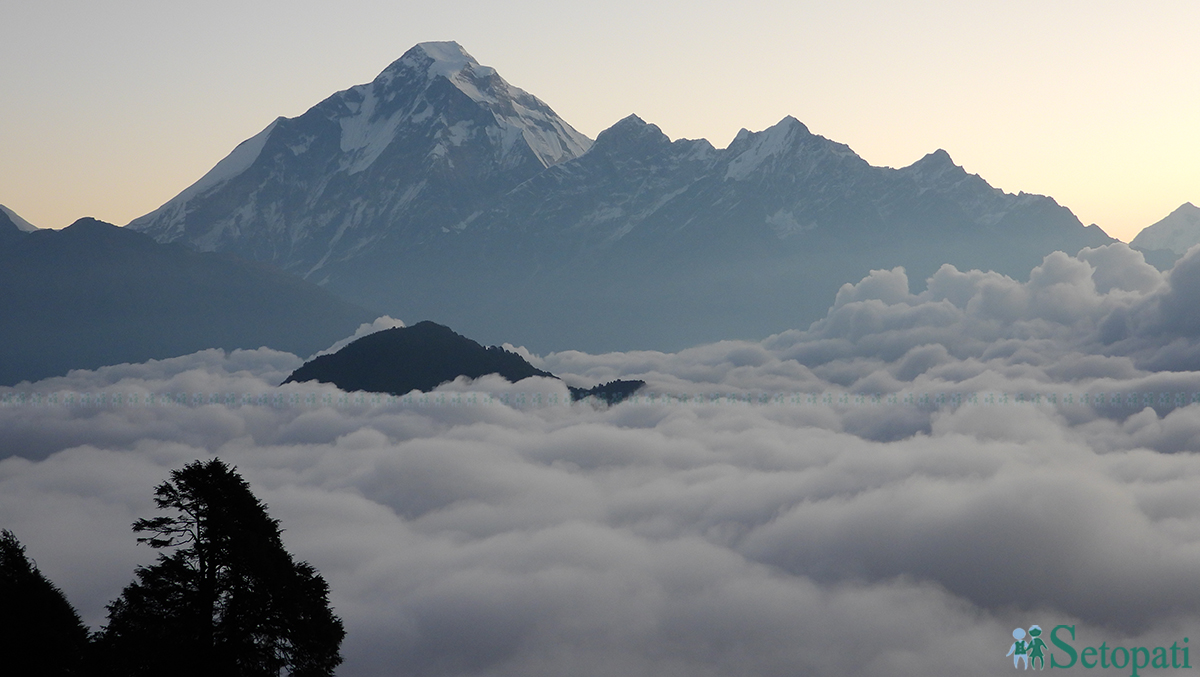 यहाँबाट ७ हजार २४६ मिटर अग्लो माउण्ट पुथादेखि माछापुच्छ्र्रेसम्मका दर्जनबढी हिमालहरू नजिकै देखिने रहेछन्। अन्नपूर्ण पहिलो र तेस्रो, धवलागिरी पहिलोदेखि छैठौंसम्म, चुरेन, निलगिरी, गुर्जा हिमालको दृष्यले मनै लोभ्याउने रहेछ। सूर्योदयसँगै हिमश्रृङ्खलामा बादलको लुकामारी सुरू हुन्छ। दर्जन हिमालहरू पालैपालो देखिन्छन्, पालैपालो लुक्छन्।
