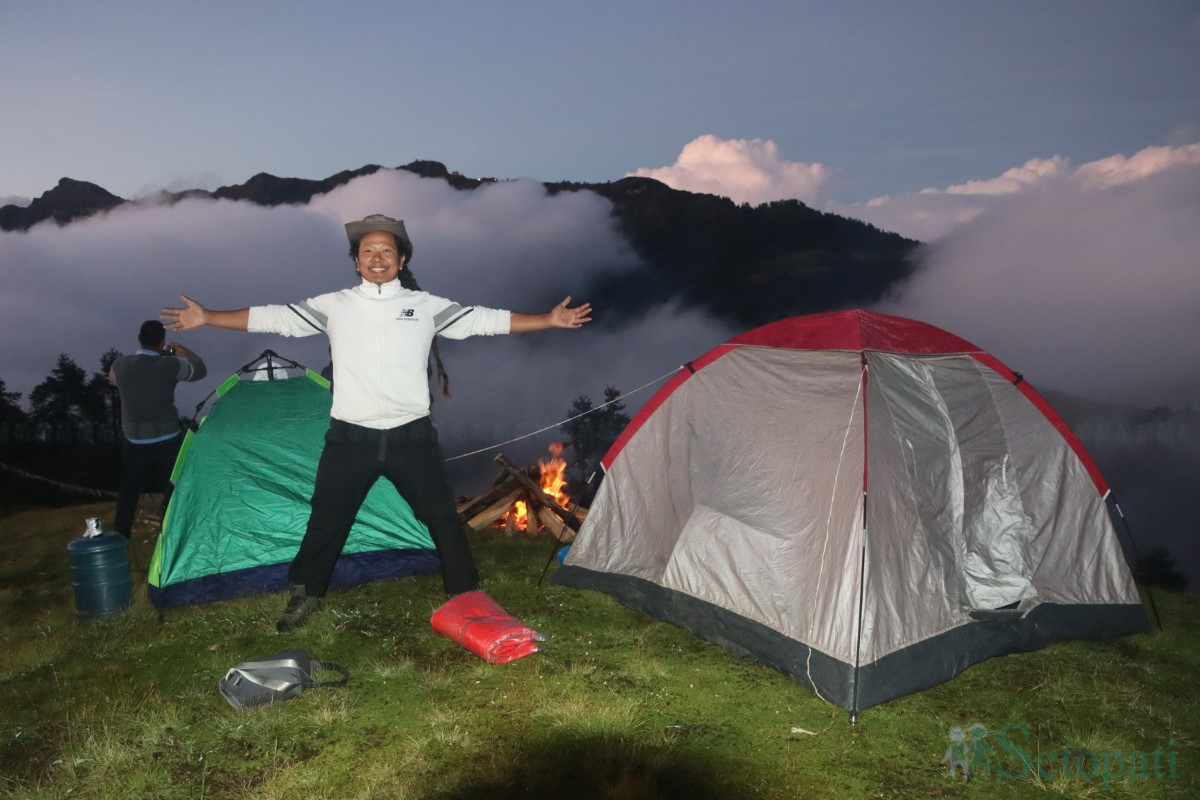 मान्छे चिनेको त संगतले हो रे। जिल्ला प्रहरी कार्यालय दोलखाका इन्सपेक्टर श्रीराम तिमल्सेनाले समेत टेण्ट रोज्दा लाग्यो—प्रकृतिको न्यानो काखभन्दा ठूलो होटल कहाँ हुन सक्छ र! करिब ३५ सय मिटरको उचाइमा हामी आठ जनाले दुई टेण्ट टाँग्यौं। बाहिर वर्षाको लगातार तप्कन, भित्र स–साना गफगाफ, नजिकै दन्केको आगो, अनि वरिपरि ढाकेर बसेको बादल।