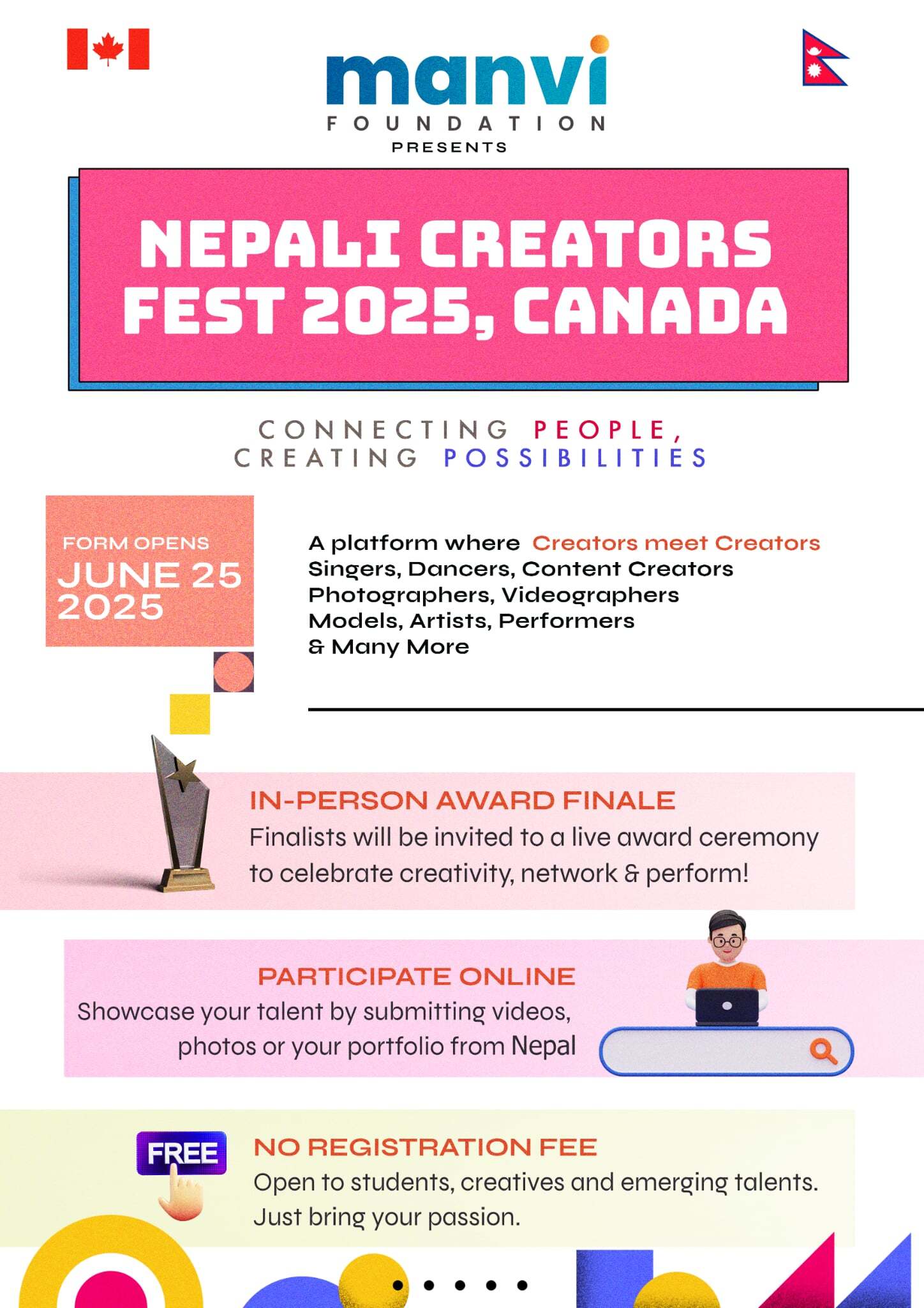 मानभी फाउण्डेशनले क्यानडामा बसोबास गर्ने नेपाली समुदायका लागि ‘नेपाली क्रिएटर्स फेस्ट २०२५’ को घोषणा गरेको छ।
