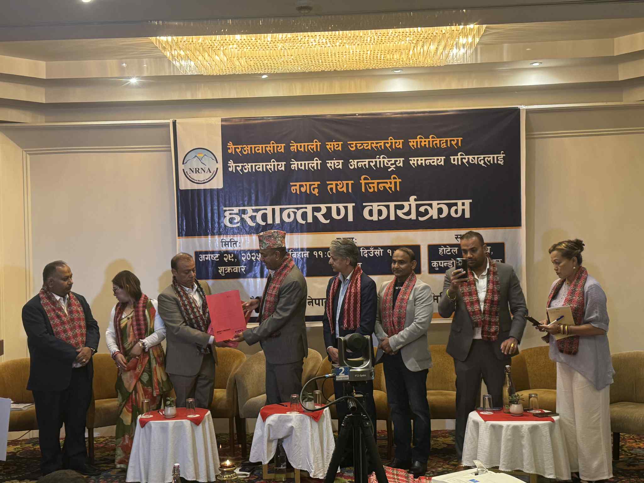 ललितपुरमा आयोजित कार्यक्रममा एनआरएनए उच्चस्तरीय समितिका सदस्य कुल आचार्यले अध्यक्ष श्रेष्ठलाई नगद तथा जिन्सी सहितका अन्य डकुमेन्ट हस्तान्तरण गरेका हुन्।