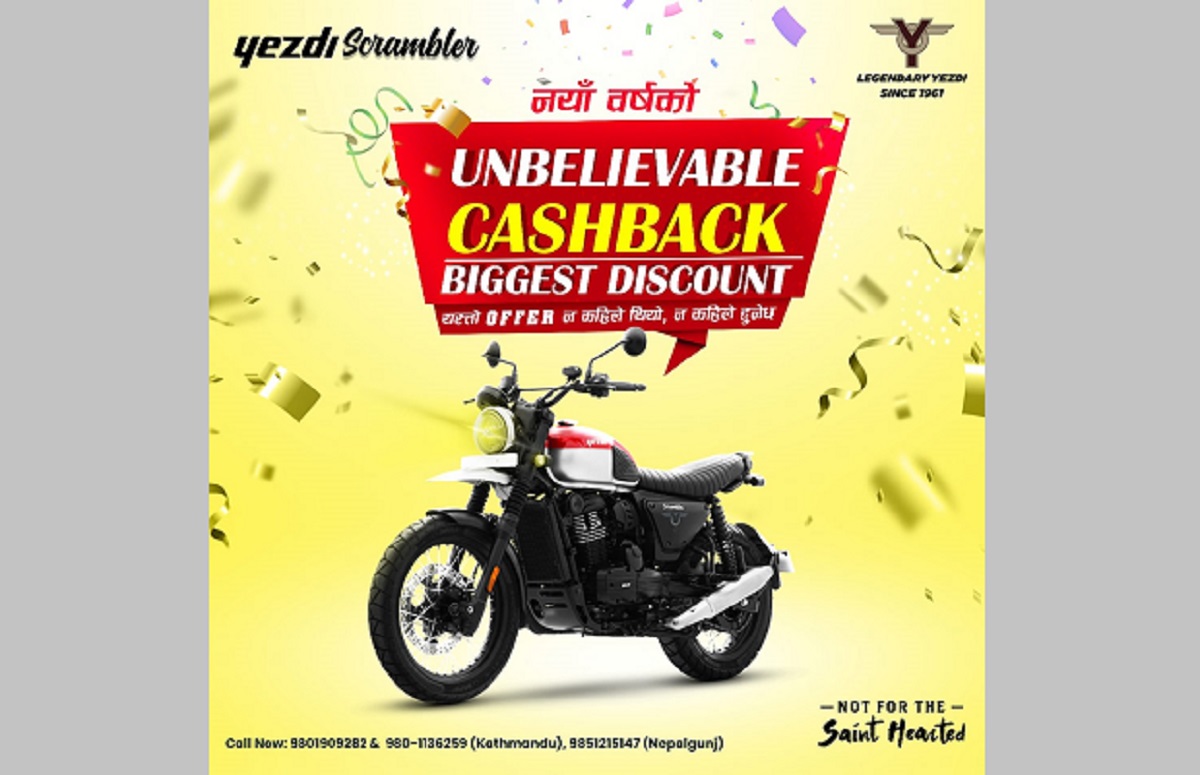 यज्डी मोटरसाइकलको एक मात्र आधिकारिक बिक्रेता अग्नि मोटोइंकले नयाँ वर्ष २०८१ को अवसरमा यज्डी स्क्रयाम्ब्लरमा जीवनमा एकपटक मात्र पाइने अफर ल्याएको छ।