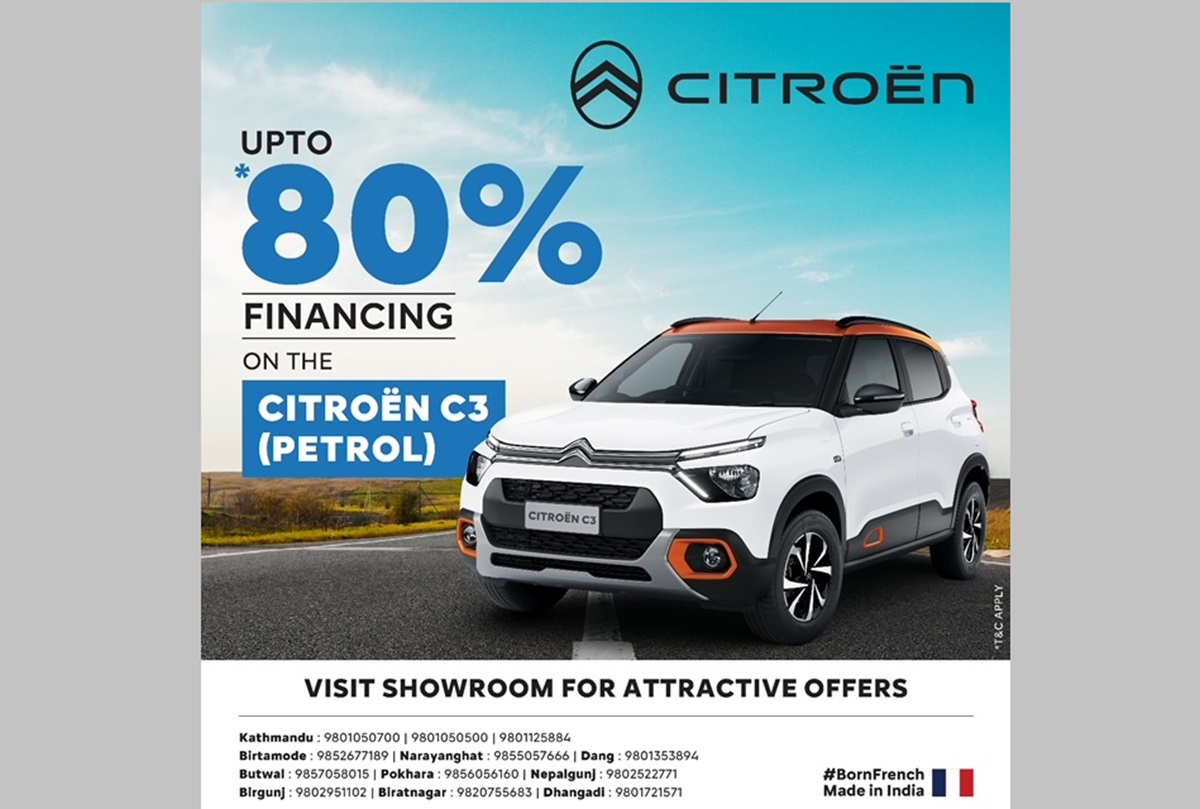 सिट्रोन गाडीको नेपालका लागि आधिकारिक वितरक सांग्रिला मोटर्सले ८० प्रतिशतसम्म फाइनान्स सुविधामा सिट्रोन सी३ को पेट्रोल भर्सन बिक्री गर्ने योजना ल्याएको छ।
