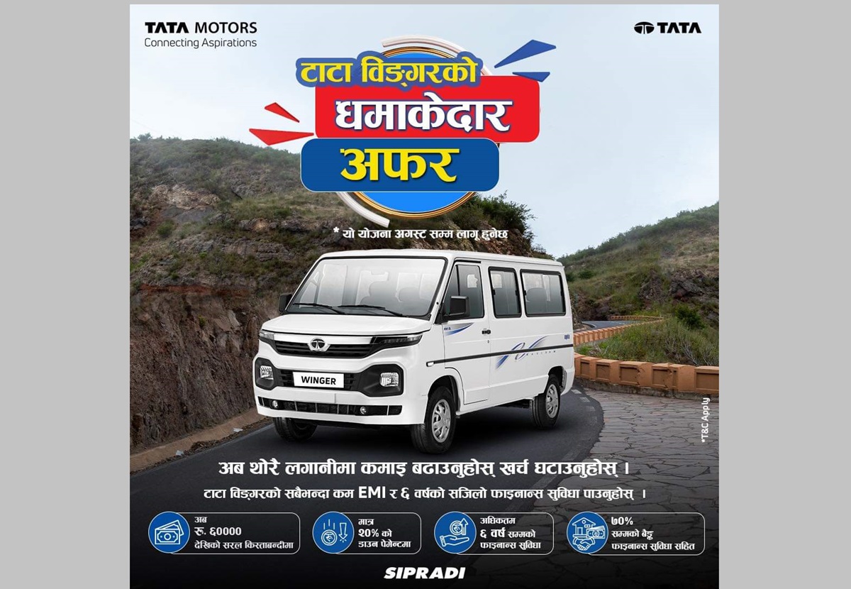 नेपालको लागि टाटा मोटर्सको एकमात्र आधिकारिक विक्रेता सिप्रदी ट्रेडिङले ग्राहकहरूको सुविधाको लागि 'टाटा विङ्गरको धमाकेदार अफर' नामक लाभदायक योजना लिएर आएको छ।