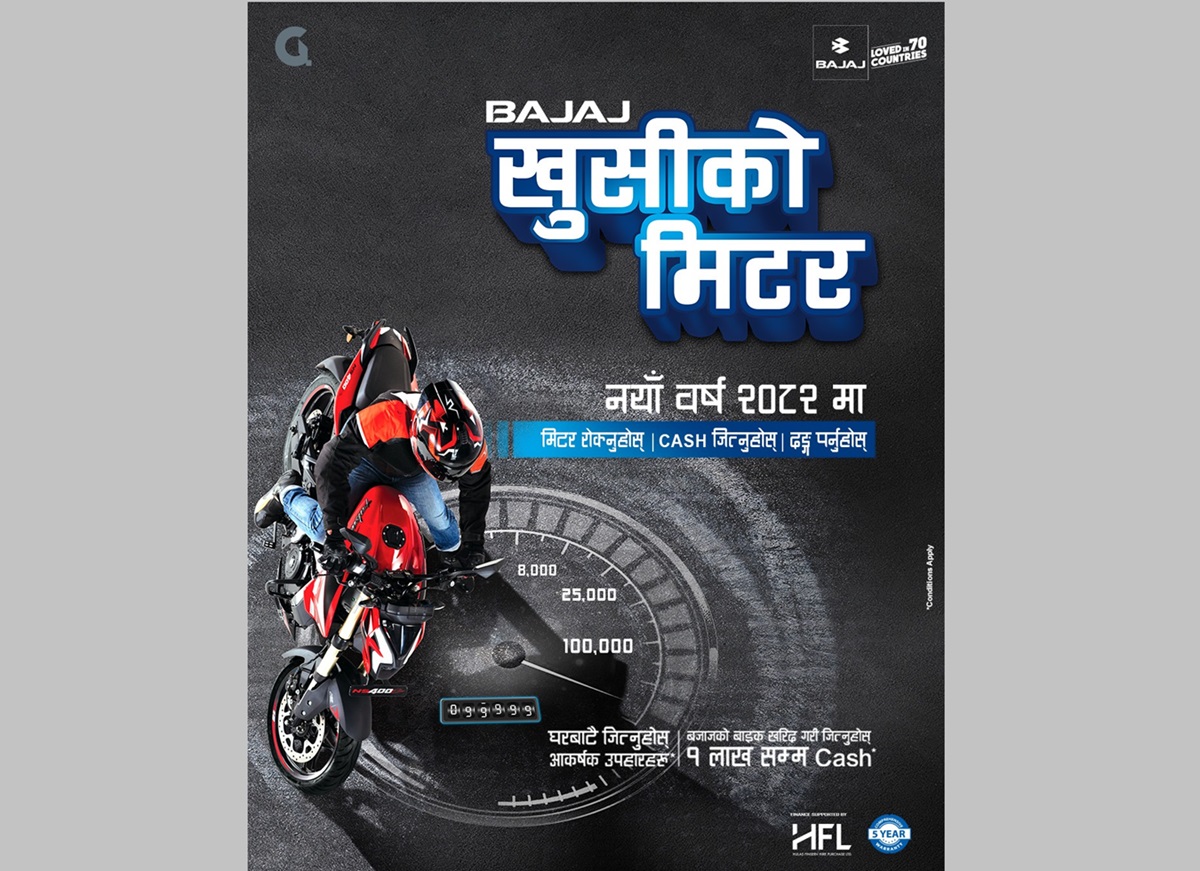 नेपालका लागि बजाज मोटरसाइकलको आधिकारिक वितरक हंसराज हुलासचन्द एण्ड कम्पनीले नयाँ वर्ष २०८२ को उपलक्ष्यमा नयाँ र रोमाञ्चक क्याम्पेन 'खुसीको मिटर' सार्वजनिक गरेको छ।