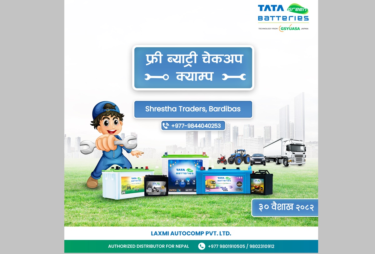 नेपालका लागि टाटा ग्रीन ब्याट्रीजको आधिकारिक वितरक लक्ष्मी अटोकोम्प प्रा.लि.ले पहिलो पटक उपत्यका बाहिर निःशुल्क ब्याट्री चेक अप शिविर सञ्चालन गर्न गइरहेको छ।