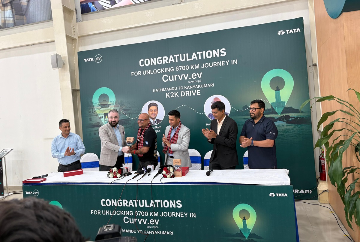 विश्व वातावरण दिवस २०८२ (जेठ २३) को दिन थापाथलीस्थित टाटा मोटर्स सोरूमबाट टाटा कर्भ इभीमा सुरू गरिएको यो विद्युतीय गाडीको यात्रा, भारतको दक्षिणी छेउ कन्याकुमारीसम्मको पुगेर करिब ६७०० किलोमिटरको यात्रापछि थापाथलीस्थित टाटा मोटर्स सोरूमबाटै सम्पन्न भएको छ।