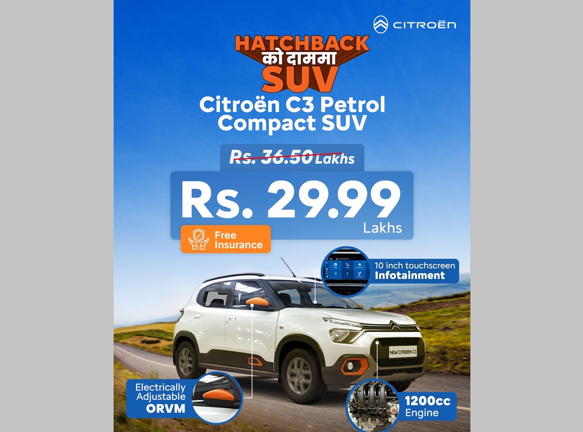 पहिले ३६ लाख ५० लाखमा उपलब्ध रहेको सिट्रोन सी३ पेट्रोल कम्प्याक्ट एसयुभी अब मात्र २९ लाख ९९ हजारमा उपलब्ध हुनेछ, जसले ह्याचब्याकको मूल्यमा एसयुभीको अनुभव प्रदान गर्छ।