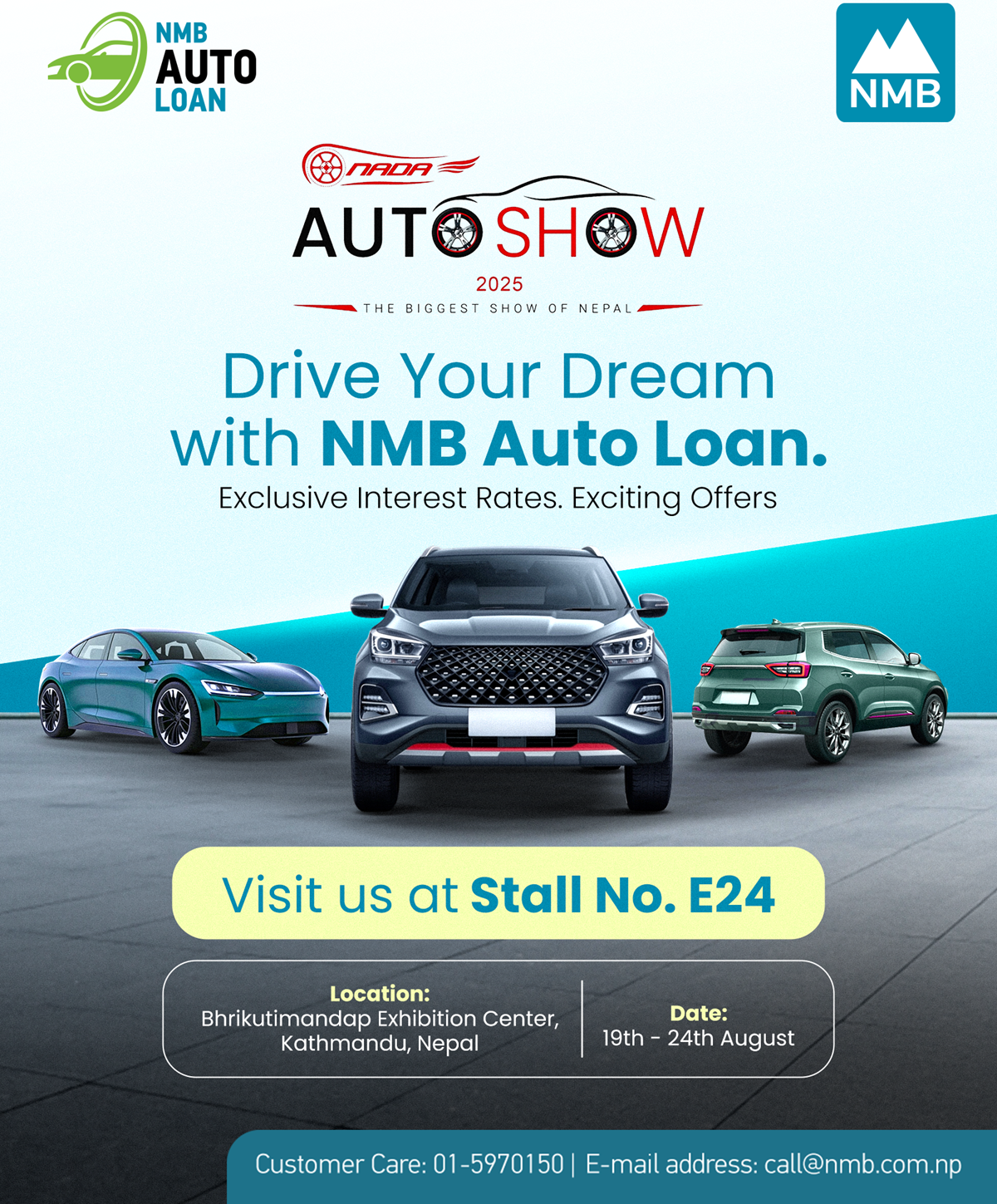 थप जानकारी एनएमबी बैंकको नजिकको शाखा वा नाडा अटो शोमा रहेको एनएमबी बैंकको स्टलबाट सम्पूर्ण जानकारी लिन सकिने बैंकले उल्लेख गरेको छ।