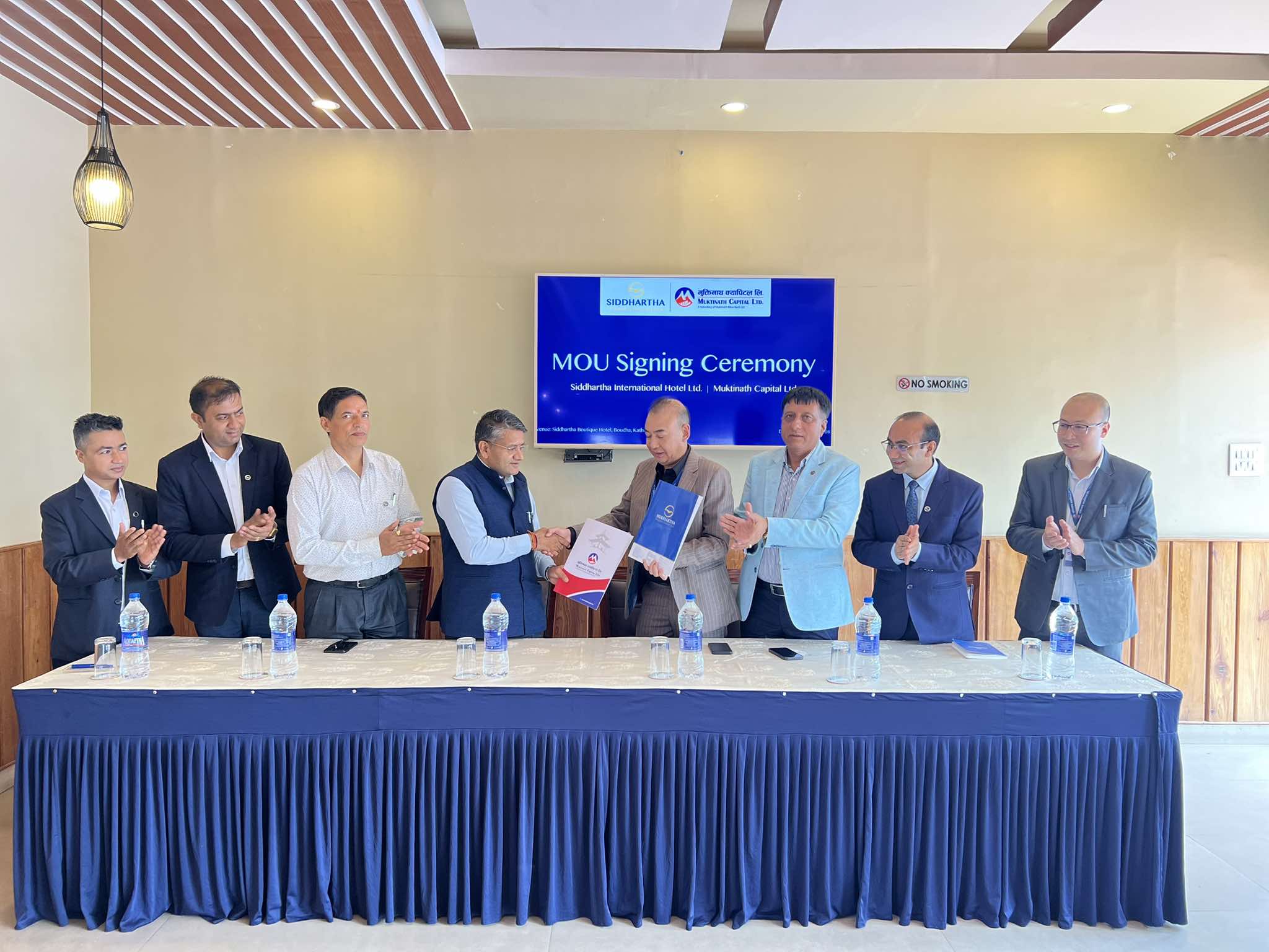सिद्धार्थ बिजनेस ग्रुप अफ हस्पिटालिटीका अध्यक्ष चिन्तामणि (लक्षमण) न्यौपाने र मुक्तिनाथ क्यापिटलका तर्फका प्रमुख कार्यकारी अधिकृत (सिइओ) कविन्द्रध्वज जोशीले हस्ताक्षर गरेका छन्।