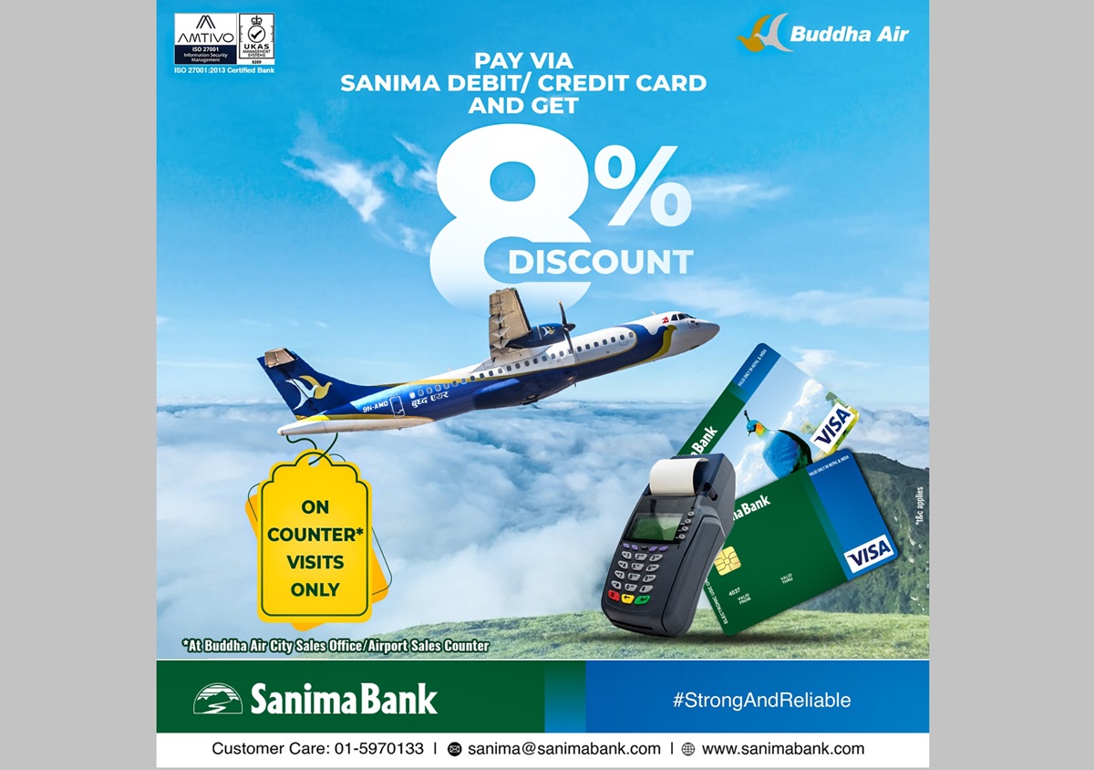 सानिमा बैंकको भिसा डेबिट/क्रेडिट कार्ड प्रयोगकर्ताहरूले डिजिटल भुक्तानी गर्दा बुद्ध एयरको टिकटमा ८ प्रतिशतको छुट प्राप्त गर्न सक्नेछन्।