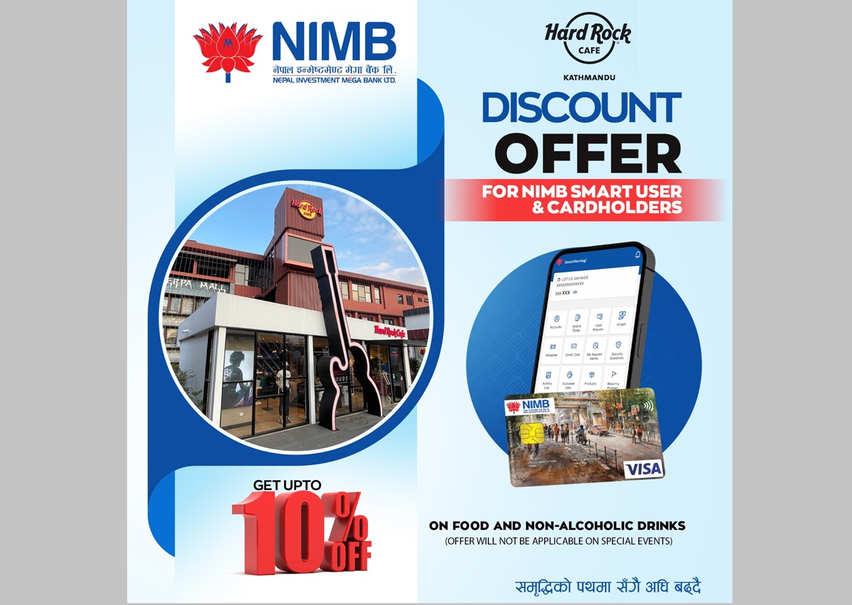 नेपाल इन्भेष्टमेण्ट मेगा बैंक (एनआइएमबी) का ग्राहकहरूले 'हार्ड रक क्याफे' मा विषेश छुट पाउने भएका छन्।