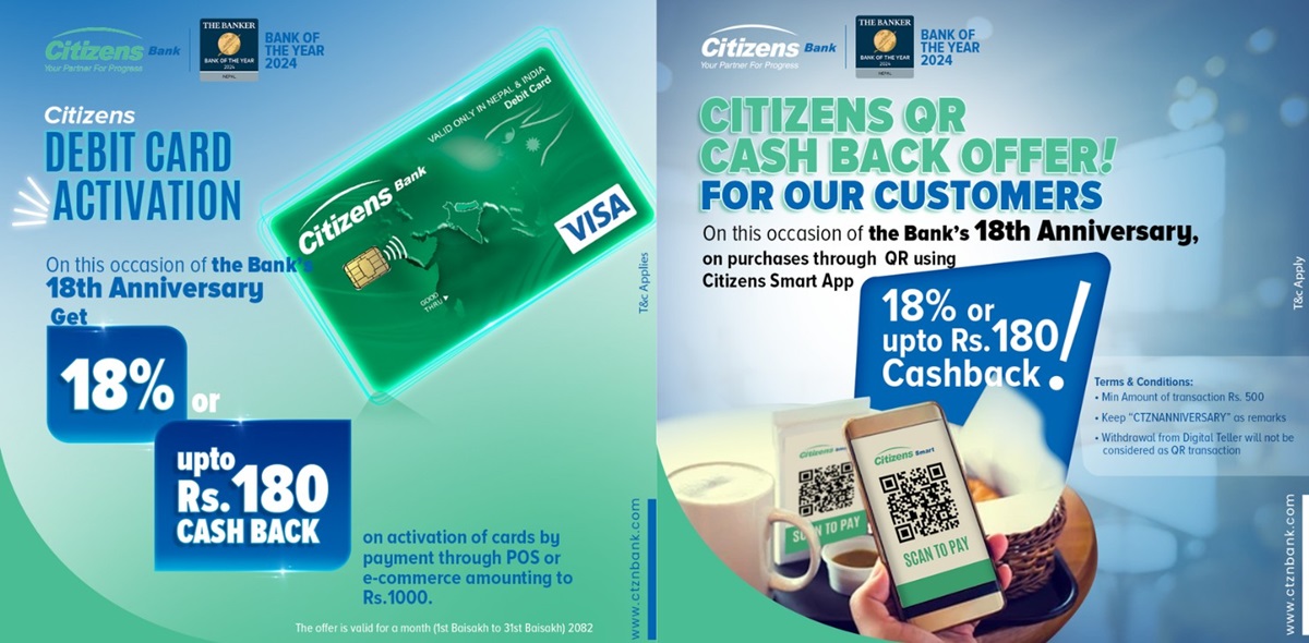 सिटिजन्स बैंक इन्टरनेसनलले आफ्नो १८औं वार्षिकोत्सवको उपलक्ष्यमा डिजिटल बैंकिङ कारोबारमा आकर्षक छुटको योजनाहरू सार्वजनिक गरेको छ।