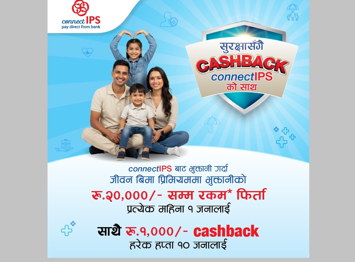कनेक्ट आइपिएसले लाइफ इन्स्योरेन्सको प्रिमियम भुक्तानी गर्दा आकर्षक रकम फिर्ता हुने गरी 'सुरक्षासँगै क्यासब्याक, कनेक्ट आइपिएसको साथ' अफर सार्वजनिक गरेको छ।