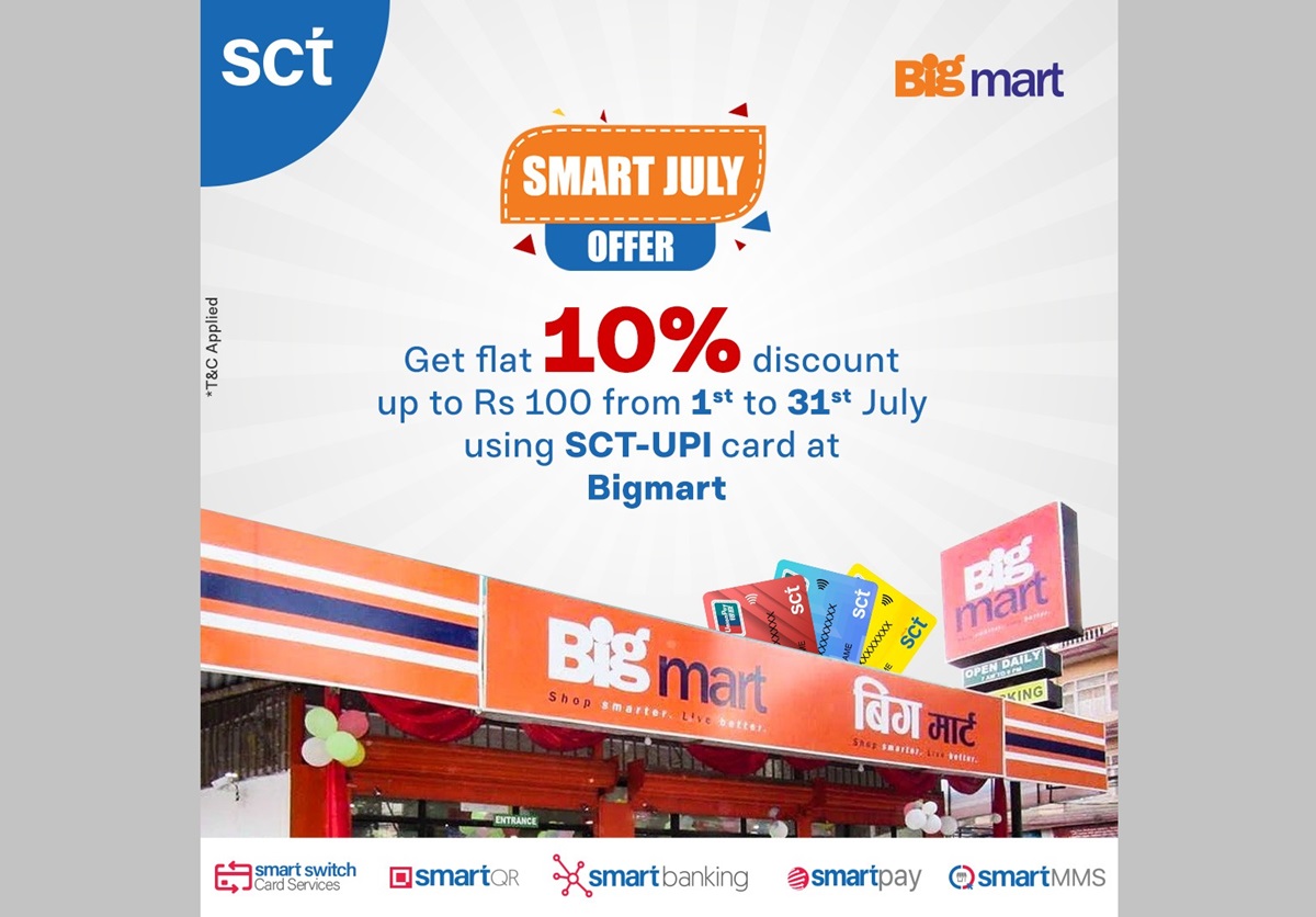 स्मार्टच्वाइस टेक्नोलोजिज लिमिटेड (एससिटी) ले नेपालको चेन स्टोर बिगमार्टमा एससिटी–युपिआई कार्ड प्रयोगकर्ताहरूका लागि स्मार्ट जुलाइ अफर ल्याएको छ।