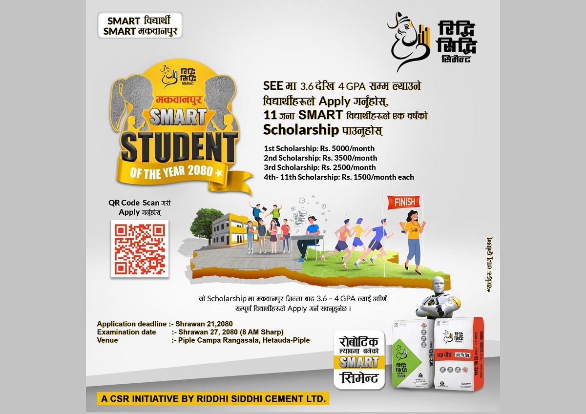 रिद्धिसिद्धि सिमेन्टले मकवानपुरलाई लक्षित 'मकवानपुर स्मार्ट स्टुडेन्ट अफ द इयर २०८०' नामक छात्रवृत्ति कार्यक्रम ल्याएको छ।
