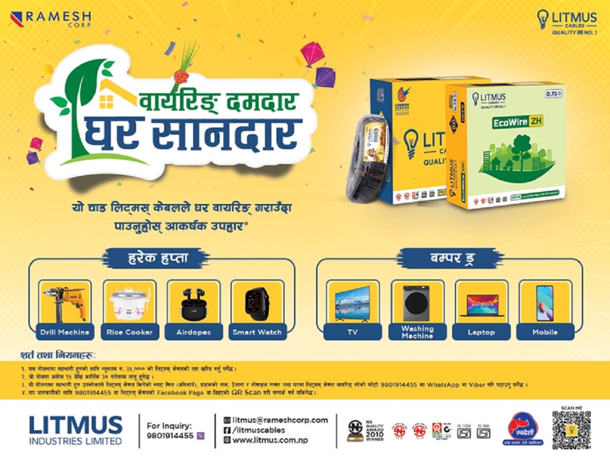 लिट्मस केबल्सले ग्राहकहरू लक्षित नयाँ योजना सार्वजनिक गरेको छ। कम्पनीले चाडपर्वको अवसरमा उपभोक्तालाई लक्षित गरी 'वाइरिङ दमदार, घर शानदार' योजना सार्वजनिक गरेको हो।