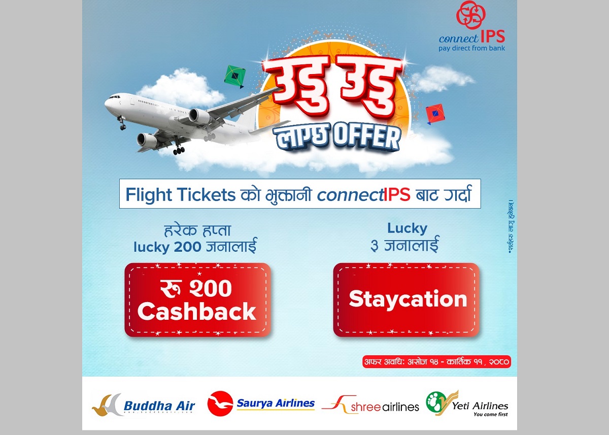 हवाइ टिकटको भुक्तानी कनेक्ट आइपिएसबाट गर्दा २०० रुपैयाँसम्म क्यासब्याक पाइने भएको छ।