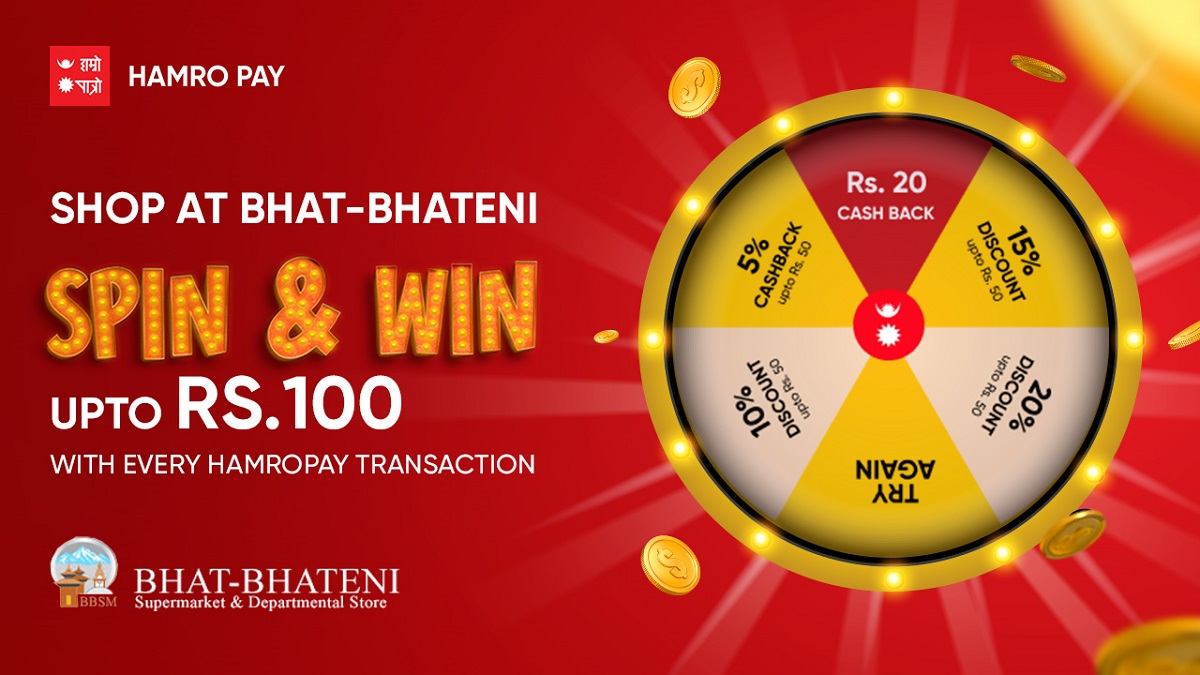 भाटभटेनीमा समेत अहिले हाम्रो पेको स्पिन एन्ड विन अफर चलिरहेको छ, जस अन्तर्गत प्रयोगकर्ताहरूले प्रत्यक भुक्तानीमा १०० रूपैयाँसम्मको क्यासब्याक प्राप्त गर्न सक्नेछन्।