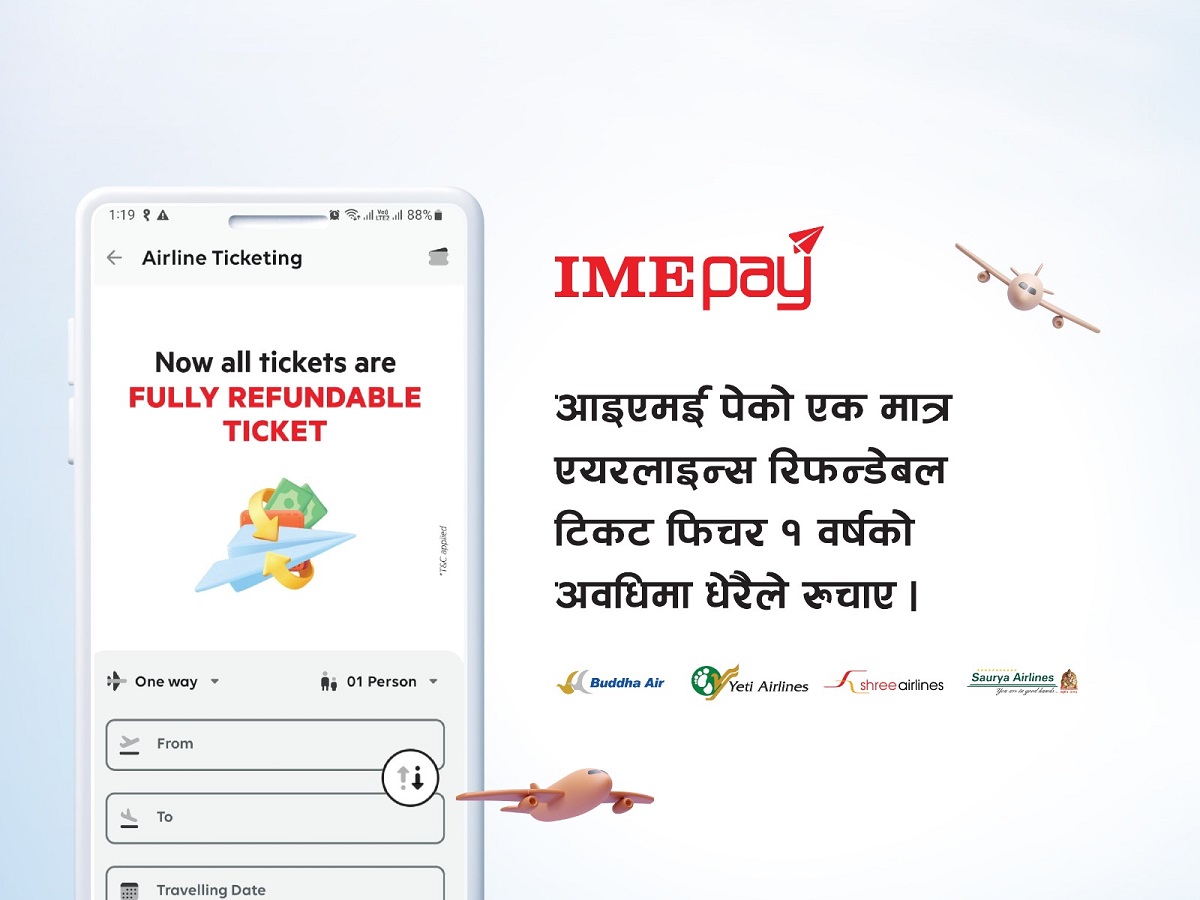 डिजिटल वालेट आइएमई पे ले सञ्चालनमा ल्याएको रिफन्डेबल फिचरमार्फत् आन्तरिक हवाई टिकट काट्नेको संख्या बढेको छ।