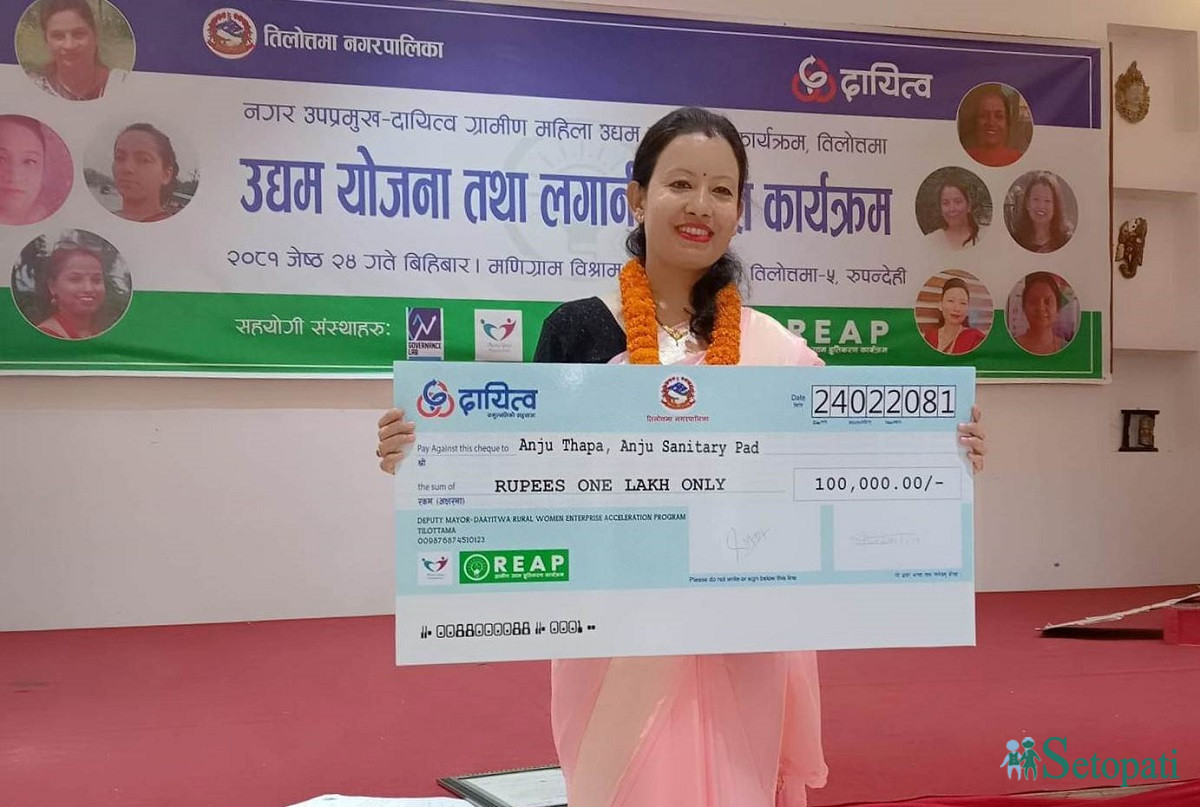 बजारमा पाइने स्यानिटरी प्याडको प्रयोगले आफ्नो स्वास्थ्यमा समस्या देखिएपछि स्यानिटरी प्याडको उद्यम सुरू गरेकी रुपन्देहीको तिलोत्तमाकी अन्जु थापा क्षेत्री सर्वोत्कृष्ट उद्यमी बनेकी छन्।