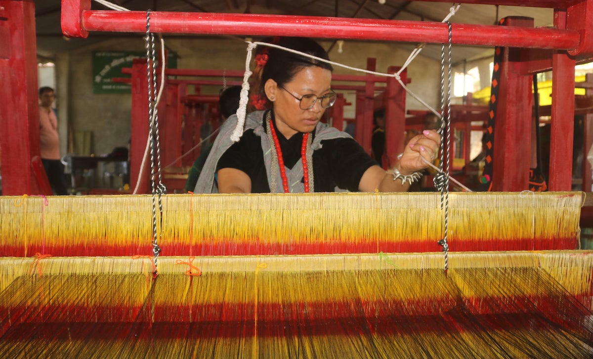 धेरै महिलाहरूले कपडा बुन्दै गरेको देखेर म त्यहाँ पसेको थिएँ। म पुग्दा कसैले साडी, कसैले पछ्यौरा, कसैले सल बुन्दै थिए। गाउँका महिलामात्र होइन क्याम्पस पढ्ने कतिपय युवतीहरू पनि तानमा कपडा बुन्न सिक्दै रहेछन्।