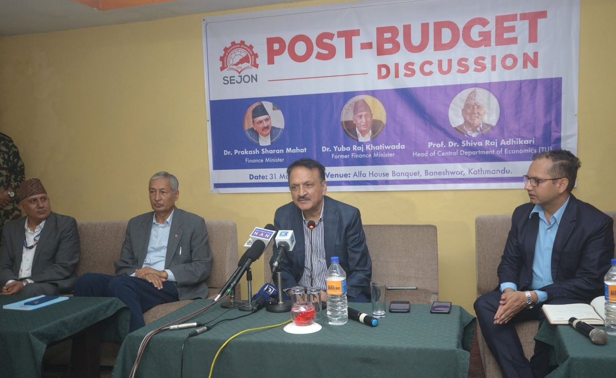 नेपाल आर्थिक पत्रकार समाजले आयोजना गरेको बजेटपछिको छलफल कार्यक्रममा पूर्वअर्थमन्त्री डा. युवराज खतिवडा, त्रिभुवन विश्वविद्यालय अर्थशास्त्र केन्द्रीय विभागका प्रमुख प्रा.डा. शिवराज अधिकारीले नेपाली अर्थतन्त्र पोलिसी ट्र्यापमा परेको बताएका हुन्।