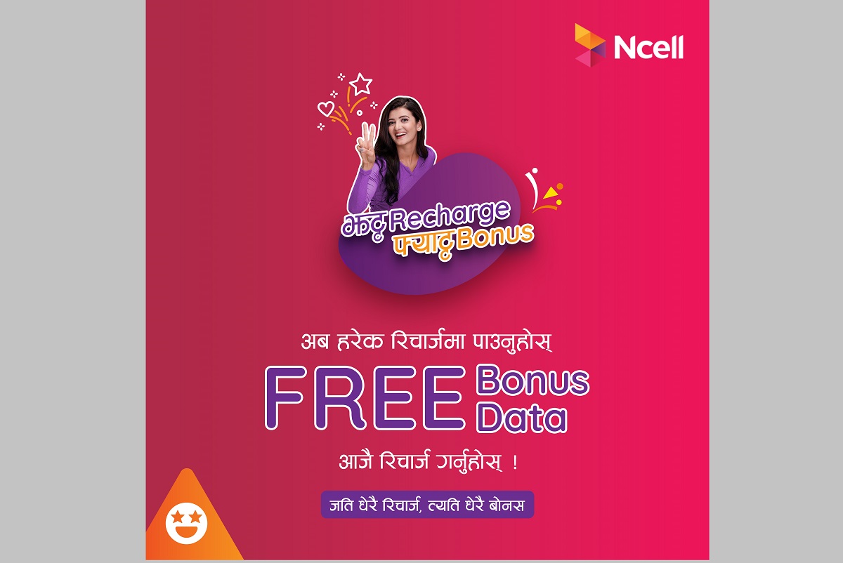 एनसेलका ग्राहकले अब प्रत्येक ५० रूपैयाँ वा सोभन्दा माथिको रिचार्जमा एक हजार एमबीसम्मको बोनस डेटाबाट फाइदा लिन सक्छन्।