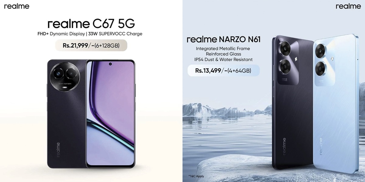 डार्क पर्पल रंगमा उपलब्ध रियलमी सि ६७ ५जी को मूल्य २१ हजार ९९९ रूपैयाँ (६+१२८ जिबी) रहेको छ भने भोयाज ब्लुमा उपलब्ध नार्जो एन ६१ को मूल्य १३ हजार ४९९ रूपैयाँ (४+६४ जिबी) रहेको छ।