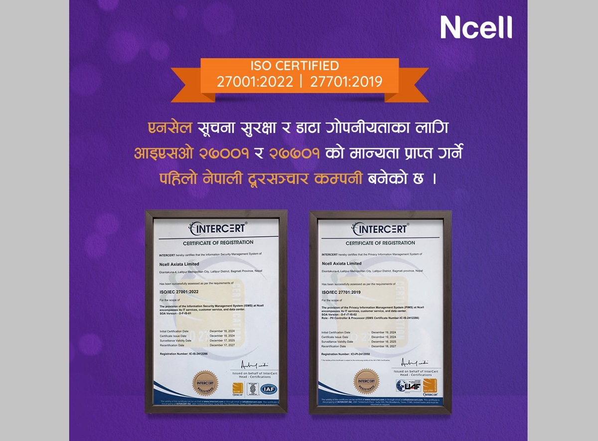 एनसेलले प्रतिष्ठित आइएसओ २७००१:२०२२ (आइएसएमएस) र २७७०१:२०१९ (पिआइएमएस)को मान्यता पाउन सफल भएको छ।