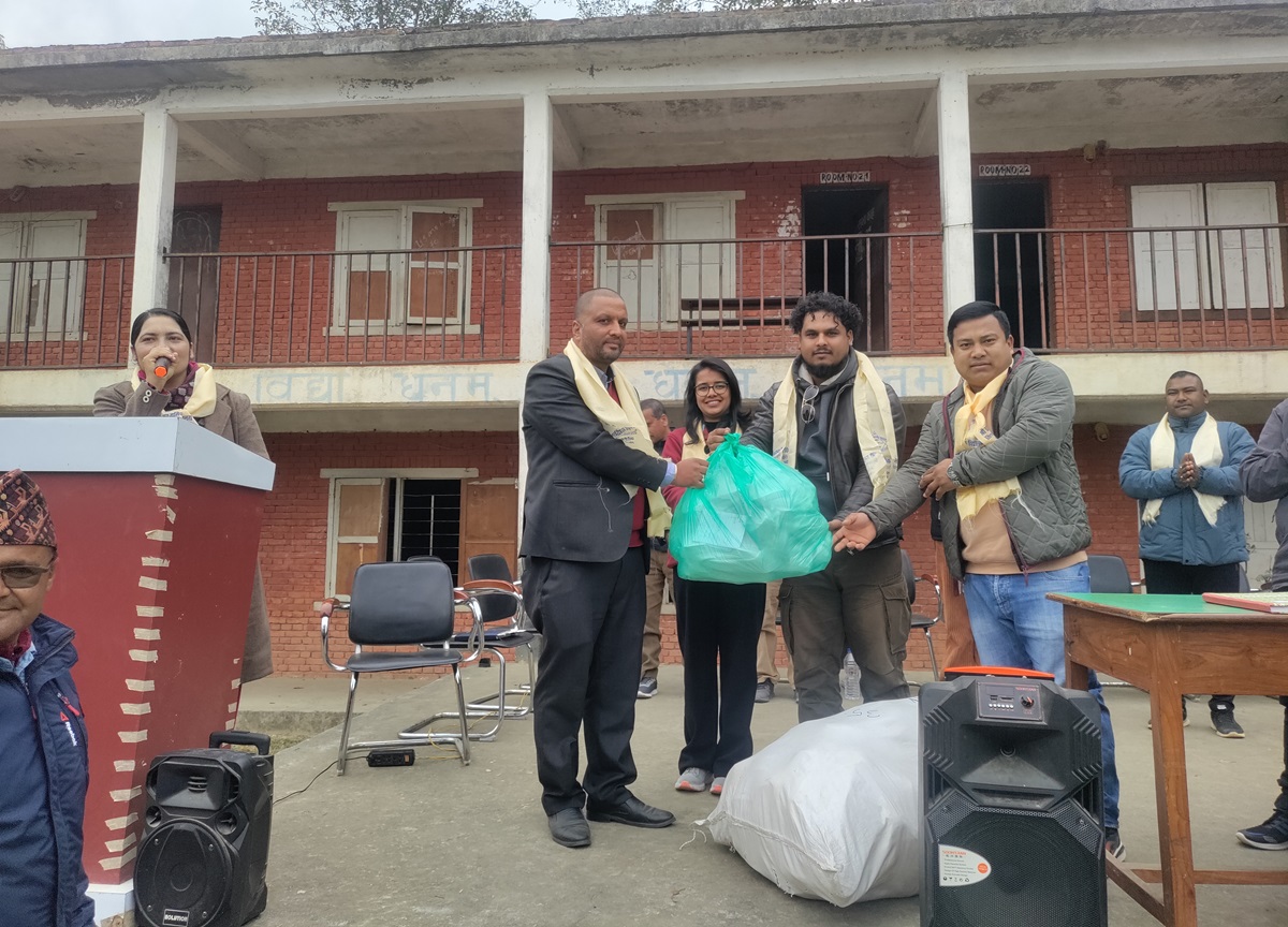 पुस २१ गते शैक्षिक सहयोगका लागि आयोजित एक विशेष कार्यक्रममा इसेवा मनी ट्रान्सफरका प्रतिनिधिहरूले विद्यालयका प्रमुख कमल केसीलाई जुत्ता र मोजा हस्तान्तरण गरे।
