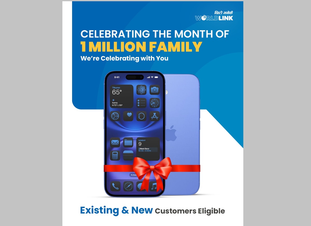 आफ्ना ग्राहक घरधुरी संख्या १० लाख पुग्न लागेको अवसरमा वर्ल्डलिंकले नयाँ सेवा एवं नवीकरण गर्दा भाग्यशाली १ जनालाई हरेक दिन आइफोन १६ उपहार दिने घोषणा गरेको हो ।