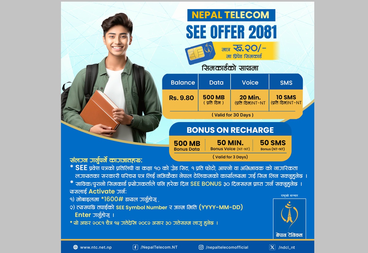 नेपाल टेलिकमले २०८१ सालको एसइई परीक्षामा सहभागी परीक्षार्थीहरूका लागि एसइई अफर २०८१ उपलब्ध गराउने भएको छ।