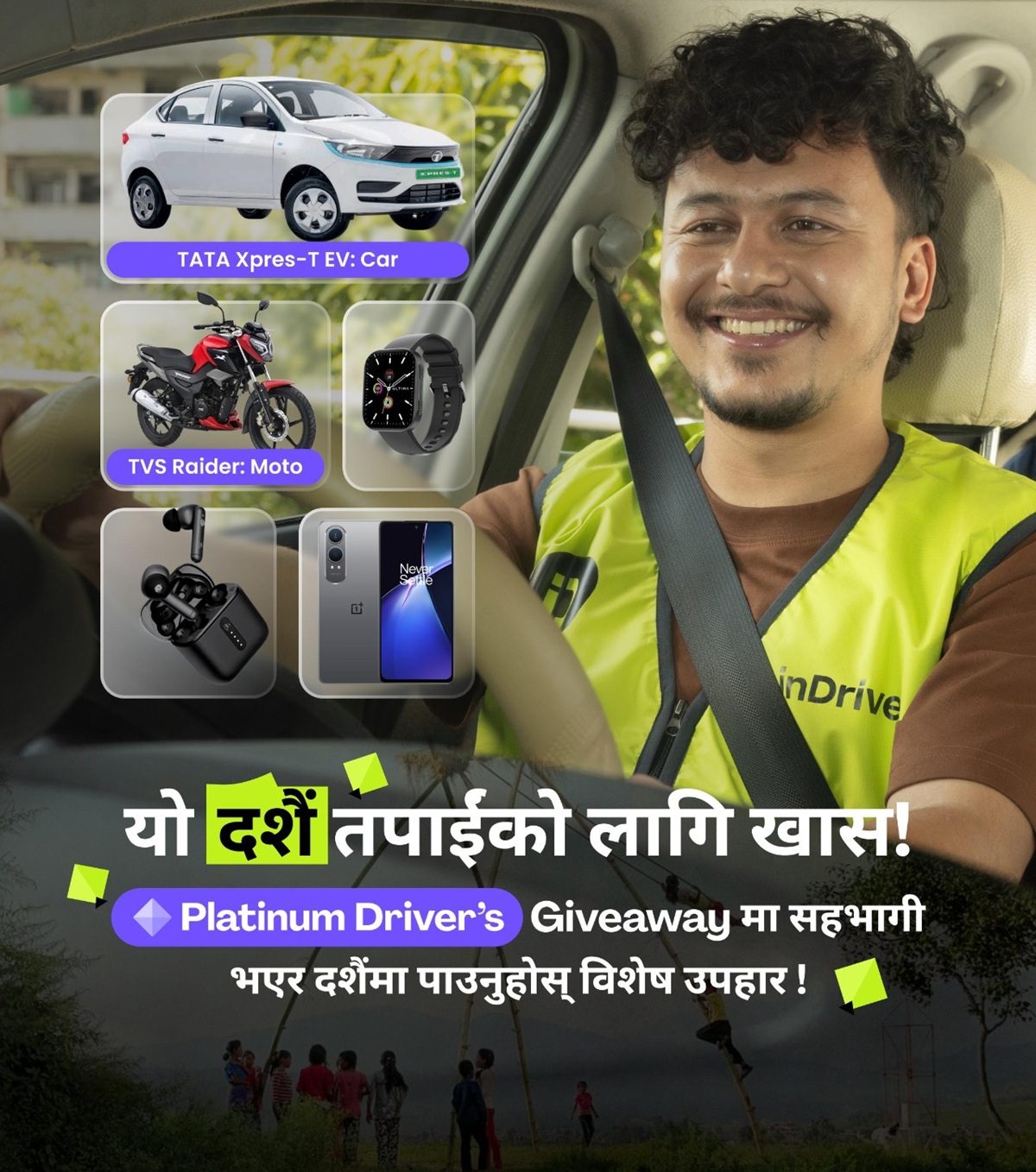 राइड सेयरिङ प्लेटफर्म इनड्राइभ नेपालले दसैं–तिहार लक्षित ‘प्लेटिनम ड्राइभर्स गिभअवे’ क्याम्पेन सुरू गरेको छ।