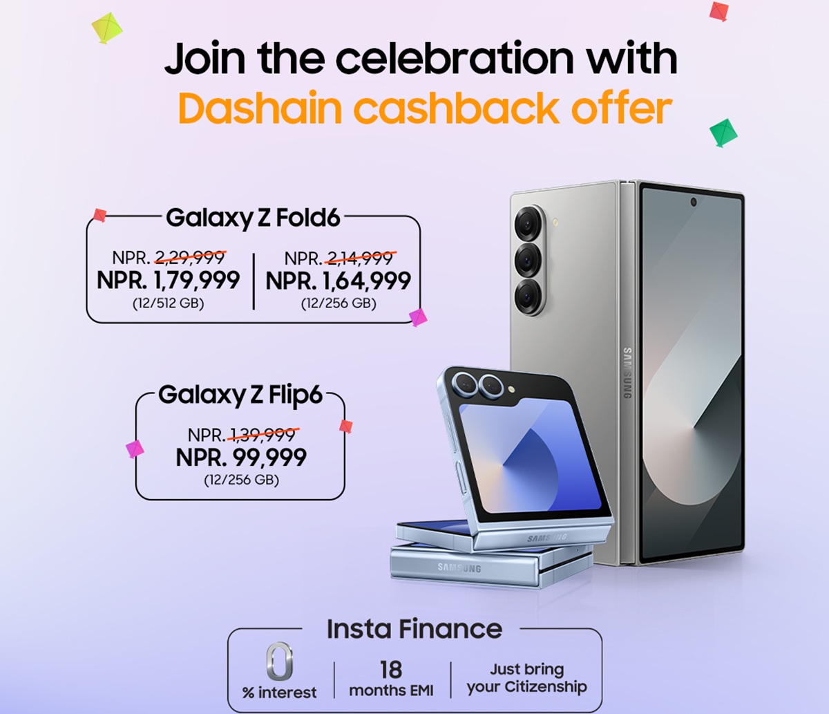 ग्राहकहरूले ग्यालेक्सी जेड फोल्ड६ वा फ्लिप६ खरिद गर्दा ५० हजार रुपैयाँसम्म क्यासब्याक पाउन सक्नेछन्। साथै, नेपालभर रहेका प्रमाणित सामसङ स्टोरहरूमा उपलब्ध सामसङ इन्स्टा फाइनान्स मार्फत् यी फोनलाई ०.५ ब्याजदरमा सजिलो इएमआई योजनामा पनि खरिद गर्न सकिनेछ। यस योजनामा १८ महिनासम्मको यन्त्र बीमा समेत समावेश गरिएको छ।