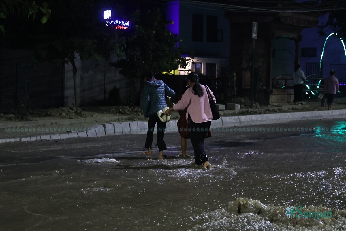 यो सडक खण्डमा नयाँ अकासे पुल बन्दै गरेको छेउमा शनिबार साँझ खानेपानीको पाइप फुटेको हो। अहिले तीनकुने–बानेश्वर सर्भिस लेन जलमग्न भएको छ।