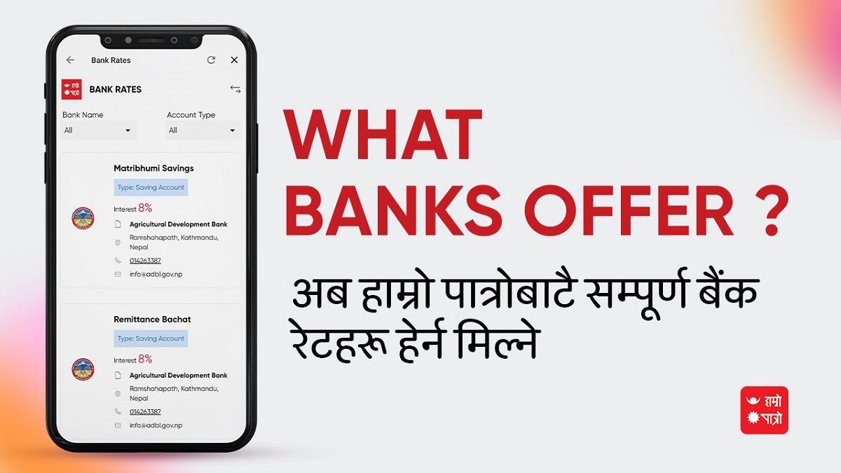 हाम्रो पात्रोले बैंक ब्याजदर तुलना गर्न सकिने फिचर ल्याएको छ। एपमा सोमबारदेखि बैंक रेट नामक नयाँ फिचर थपिएको हो।