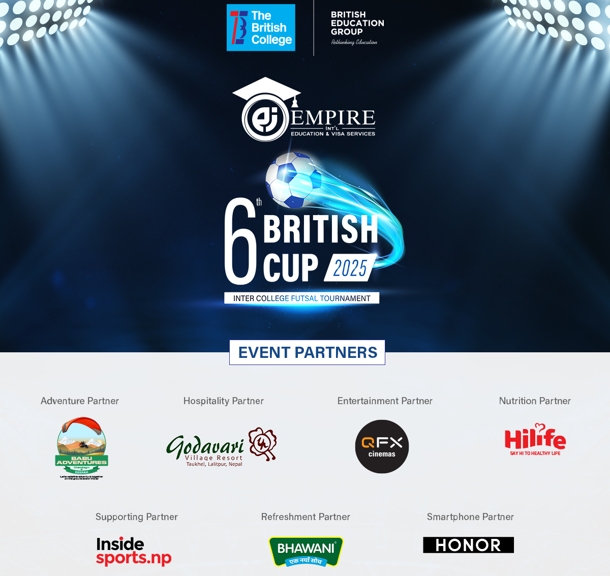 द ब्रिटिस कलेज (टीबीसी) ले छैटौं ‘ब्रिटिस कप २०२५ इन्टर कलेज फुटसल टुर्नामेन्ट’ आयोजना गर्ने भएको छ।