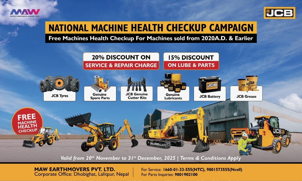 नेपालमा जेसिबीका अधिकृत डिस्ट्रीब्युटर एमएडब्लू अर्थमुभर्सले सन् २०२० र त्यसअघि बिक्री भएका सबै जेसिबी मेसिनका लागि ‘नेशनल मेसिन हेल्थ चेकअप क्याम्पेन’ सुरु गरेको छ।