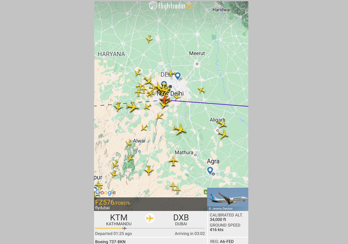 फ्लाइट राडारका अनुसार राति पौने ११ बजे विमान भारतको नयाँदिल्लीको आकाशमा उडिरहेको छ।