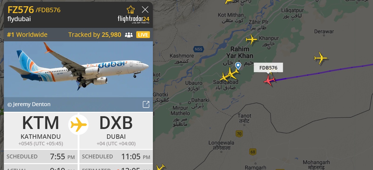 सोमबार राति ९:२०मा त्रिभुवन अन्तर्राष्ट्रिय विमानस्थलबाट उडेको फ्लाई दुबईको एफजेड ५७६ जहाजको एउटा इन्जिनमा समस्या देखिएको थियो। इन्जिनमा समस्या आएपछि आगोको झिल्को र ठूलो आवाज आएको थियो।