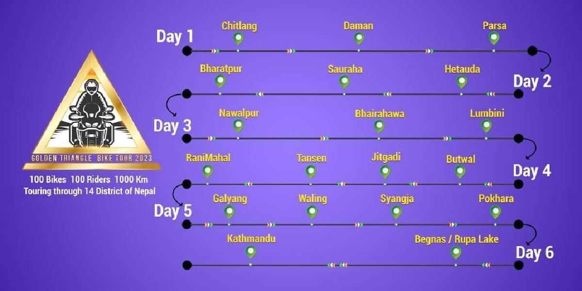 नेपाल पर्यटन बोर्ड, नाट्टा, टान, एफएनसिसिआई लगायत संघ-संस्थासँगको समन्वय तथा सहकार्यमा पत्रकार, कलाकार, साहित्यकार, बाइकरसहित एक सय जनाको राइडर्स टिमले काठमाडौं–हेटौंडा–चितवन–लुम्बिनी–पाल्पा–पोखरा रूटमा 'गोल्डेन ट्र्यांगल बाइक टूर' गर्न लागिएको हो।