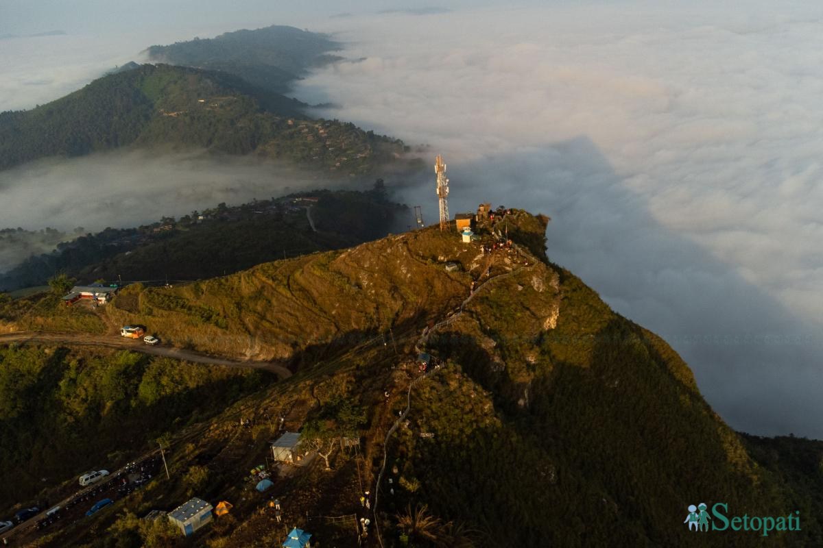 आँखाले भ्याइन्जेलसम्म बादल देखिन्छ, त्यसपछि हिमालका मनमोहक दृश्य। बादल चिरेर निस्किएजस्तै देखिन्छ सूर्योदय।