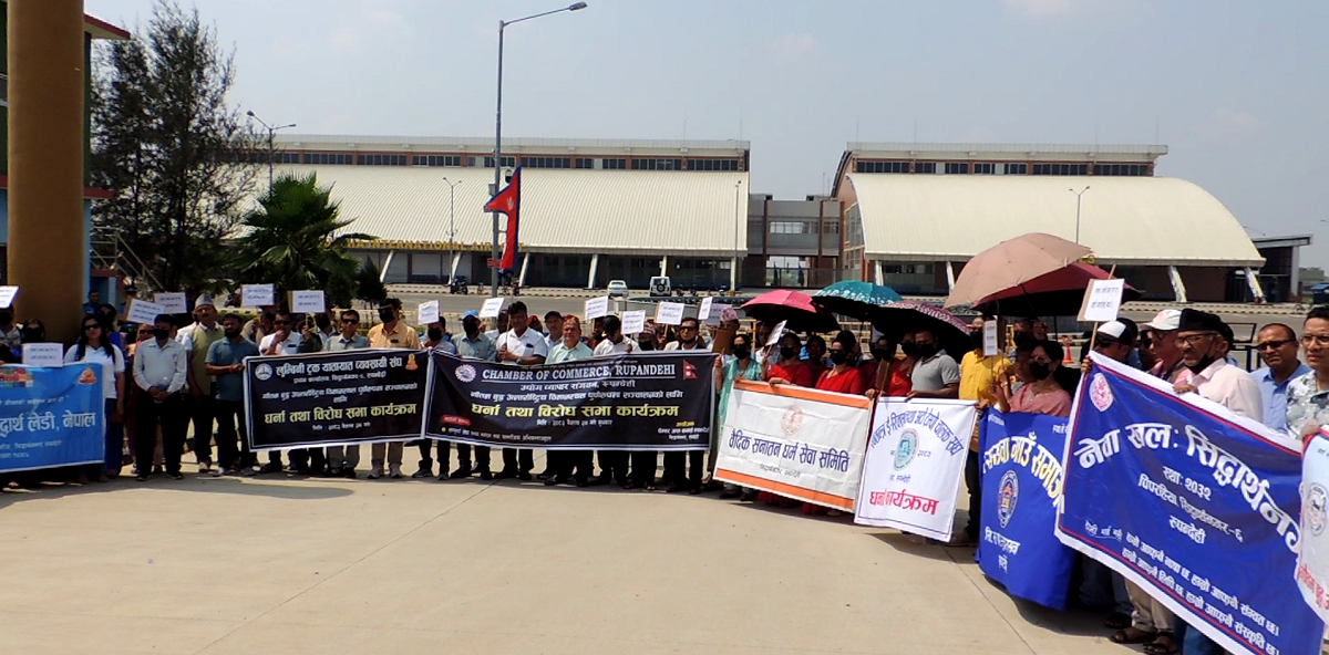 उद्योग व्यापार संगठन रूपन्देहीको अगुवाइमा उद्योगी व्यवसायीहरूले बुधबार बिहान १० बजेदेखि ११ बजेसम्म विमानस्थलको मुख्य प्रवेशद्वारमा धर्ना र प्रदर्शन गरेका थिए।