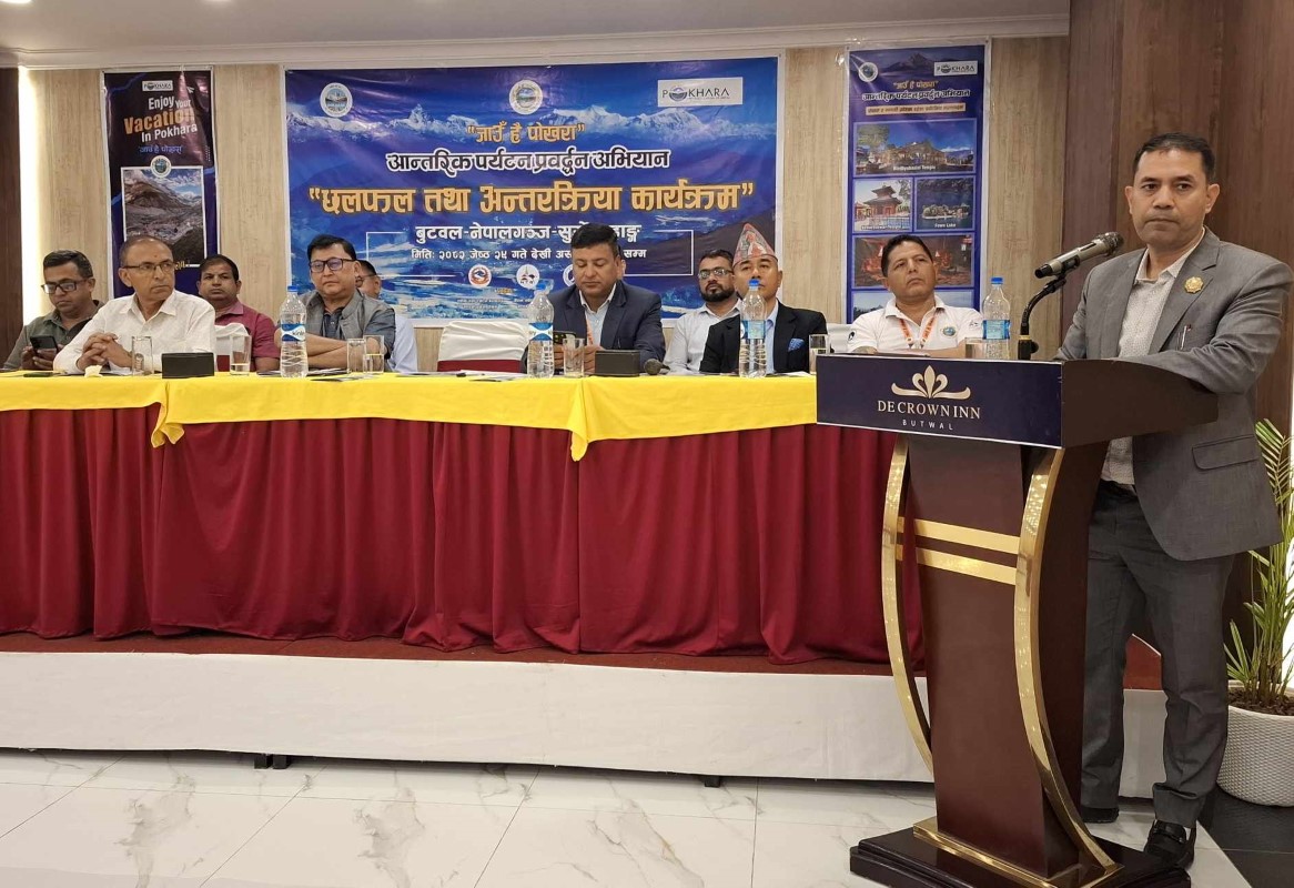 होटल संघ पोखराका अध्यक्ष लक्ष्मण सुवेदीको नेतृत्वमा पर्यटन व्यवसायीहरूको टोलीले शुक्रबार बुटवलमा रूपन्देहीका पर्यटन व्यवसायी तथा पत्रकारहरूसँग छलफल गरेको हो।